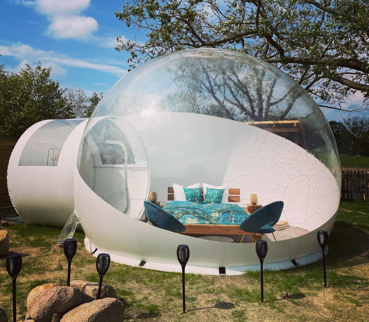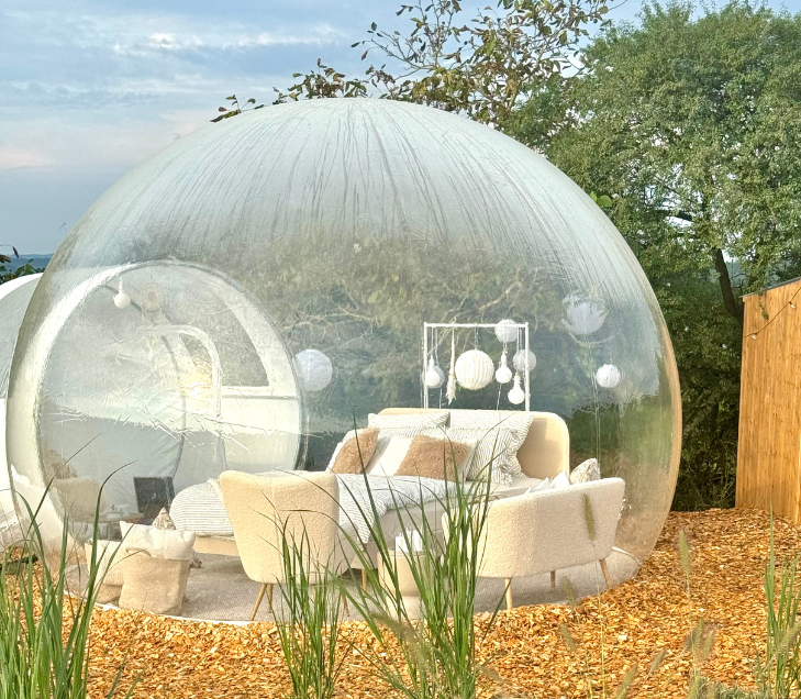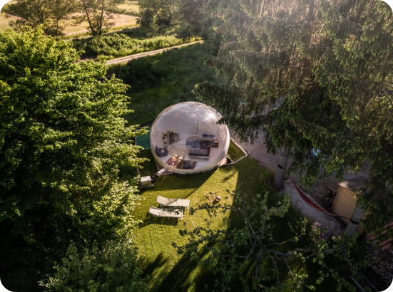 Unsere Bubble Tents an den deutschen Standorten stammen alle von Bubble Tent Deutschland und erfüllen höchste Qualitäts- und Sicherheitsstandards. Jedes Zelt wurde von der DEKRA geprüft und ist REACH-zertifiziert, was garantiert, dass sie frei von schädlichen Chemikalien sind. Nachhaltigkeit liegt uns am Herzen: Unsere Bubbles sind zu 100 % recycelbar und können nach ihrer Nutzungsdauer in den Stoffkreislauf zurückgeführt werden.
