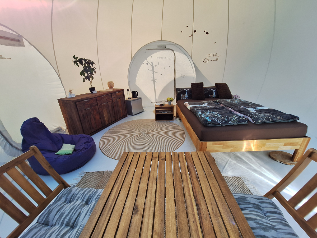 Die Ausstattung in und ums Zelt ist klasse: von Stühlen über Terrasse mit weiteren Sitzmöbeln und Tisch, Bett in Zelt sowie auch hier Tisch und….