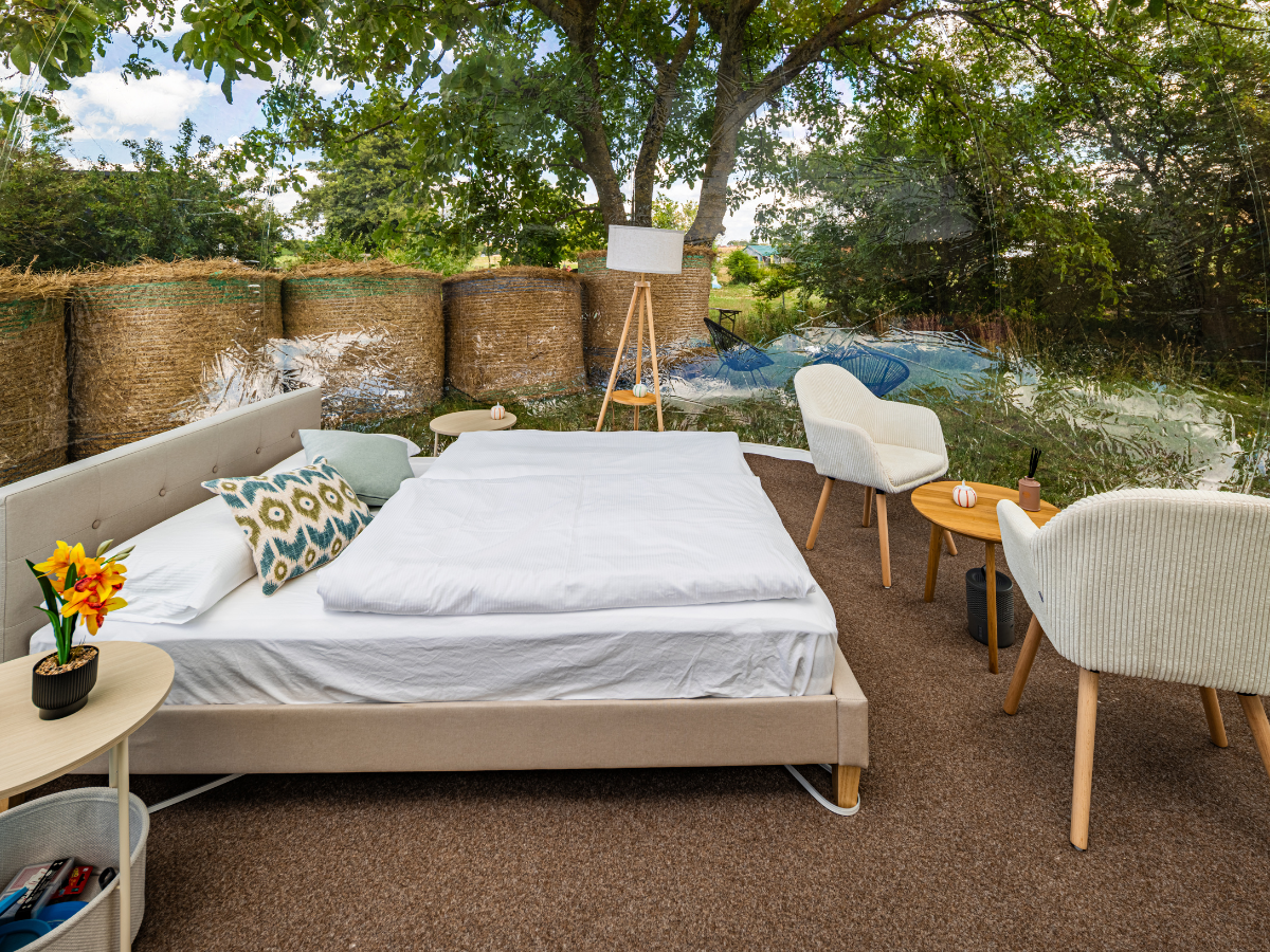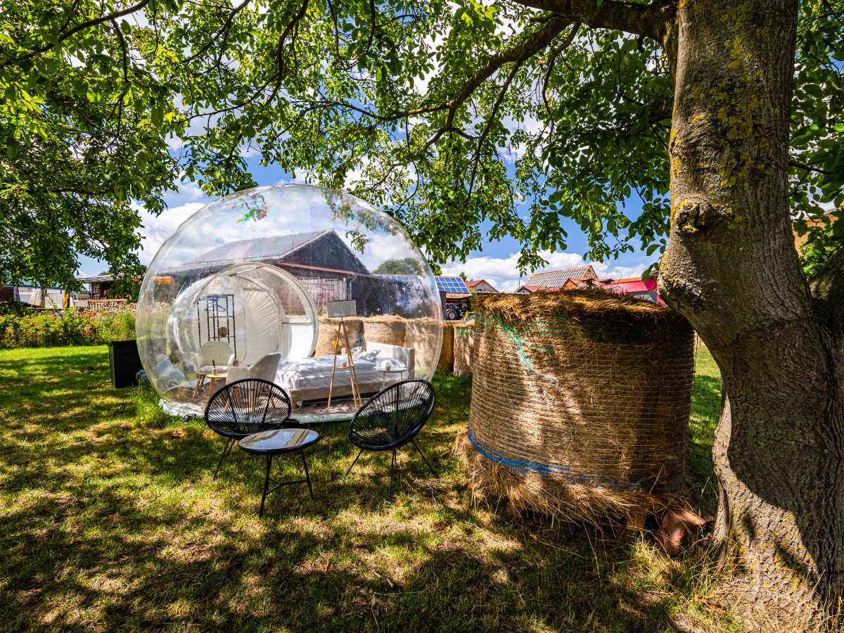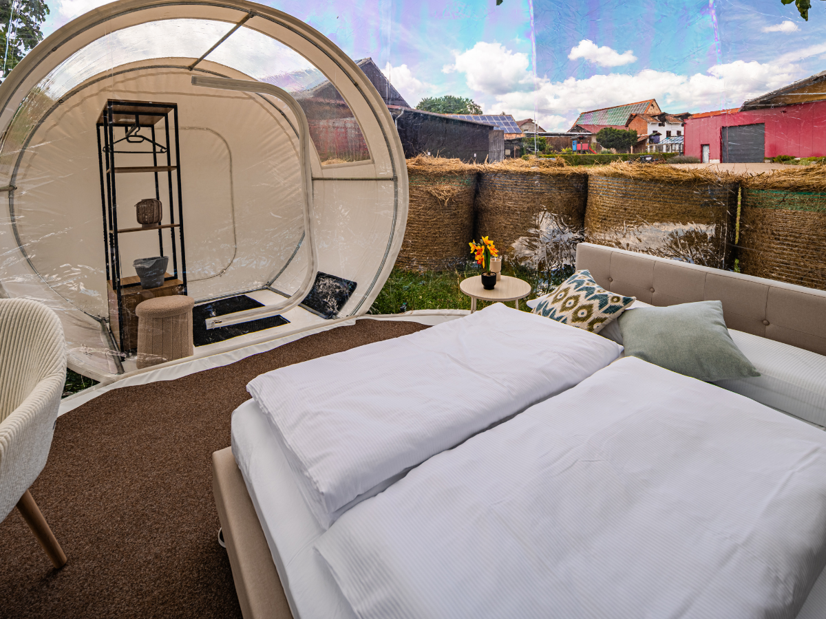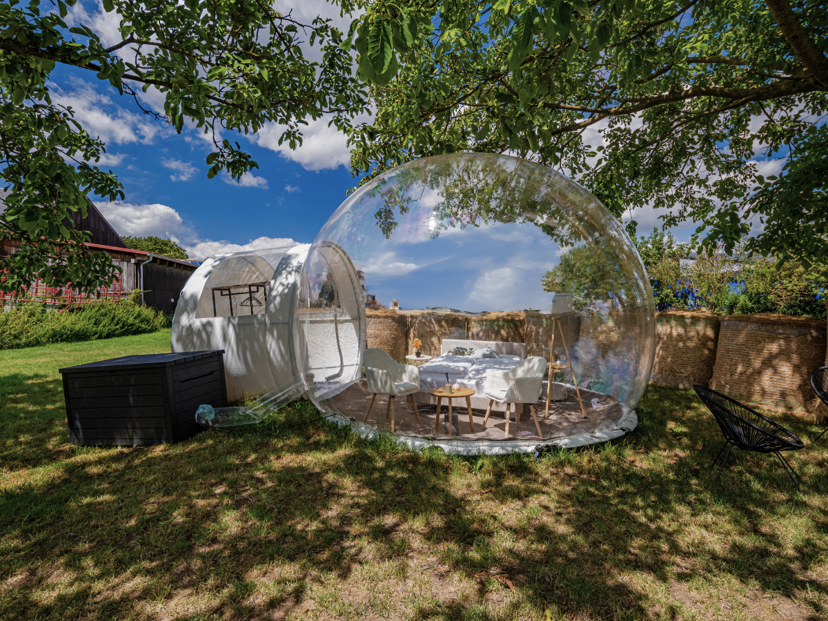 Die Bubble ist eine luftgestützte, transparente Kuppel mit Schleusen-Eingang. Ein leises Gebläse (Flüsterlautstärke) hält die Form und sorgt für Frischluft.