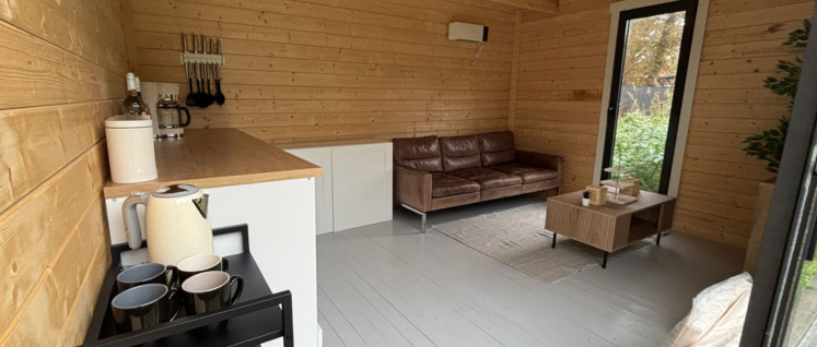 Auf unserem Standort entsteht eine liebevoll gestaltete kleine Wohlfühloase mitten in der Natur. Dich erwartet ein gemütliches Häuschen mit Veranda, in dem du eine voll ausgestattete Innenküche sowie eine bequeme Sitzecke mit Couch findest.