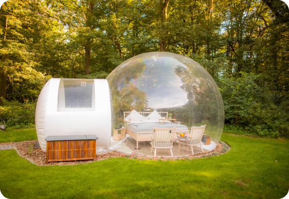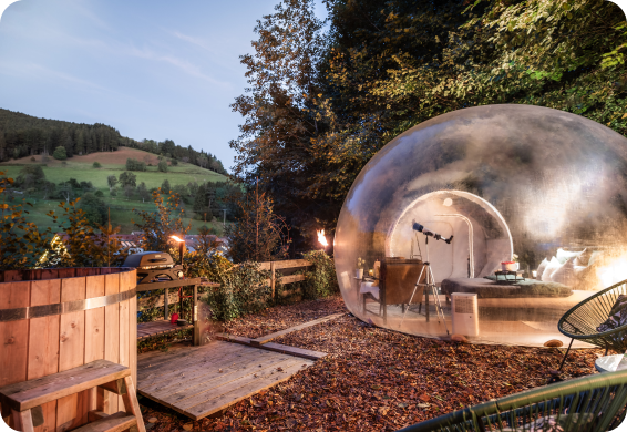 Willkommen in einer Welt, in der Natur auf Luxus trifft – willkommen bei Book a Bubble! Egal, ob du einen romantischen Ausflug oder einen einzigartigen Familienurlaub planst, unsere Bubble Hotels bieten dir das ultimative Glamping-Erlebnis. An den schönsten Orten in Deutschland und Frankreich gelegen, sind unsere Zelte so konzipiert, dass sie dich die Schönheit der Natur hautnah erleben lassen und dir gleichzeitig den Komfort eines hochwertigen Hotels bieten. Stell dir vor, du schläfst unter einem Sternenhimmel ein und wachst zu den sanften Klängen der Natur auf – und das alles in deinem gemütlichen, gut ausgestatteten Tent.